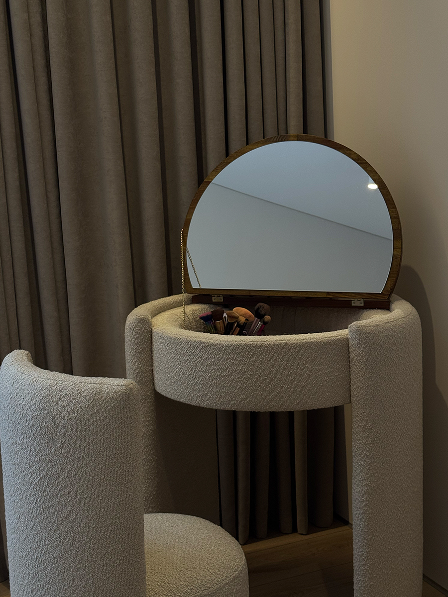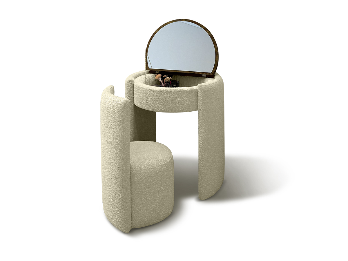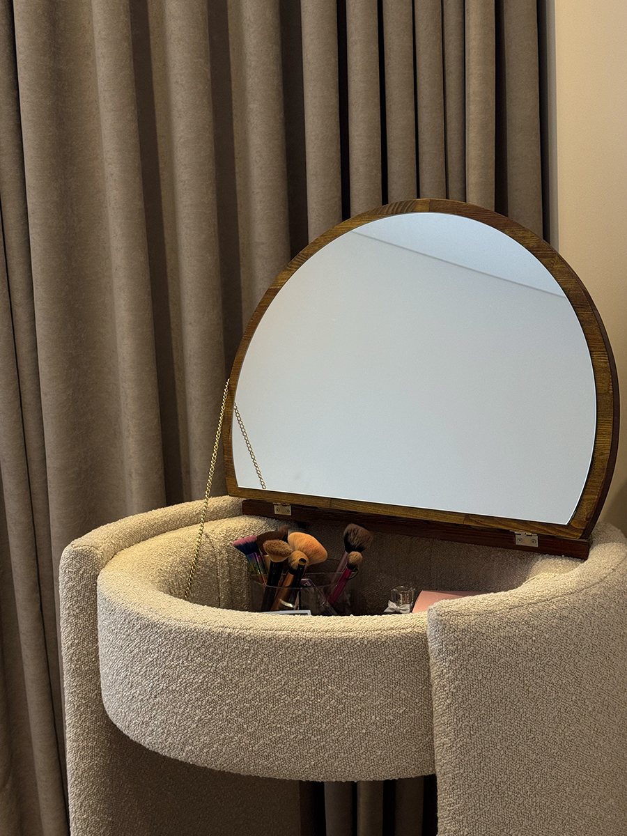 Чарівний косметичний столик із кріслом поєднує стиль і практичність. Він має нішу для зберігання косметики, вбудоване дзеркало та стільницю з натурального дерева. У закритому вигляді столик компактний, може слугувати робочою поверхнею або стильною консоллю. Тканину крісла можна обрати в будь-якому кольорі — у тон ліжка або як акцент інтер’єру.