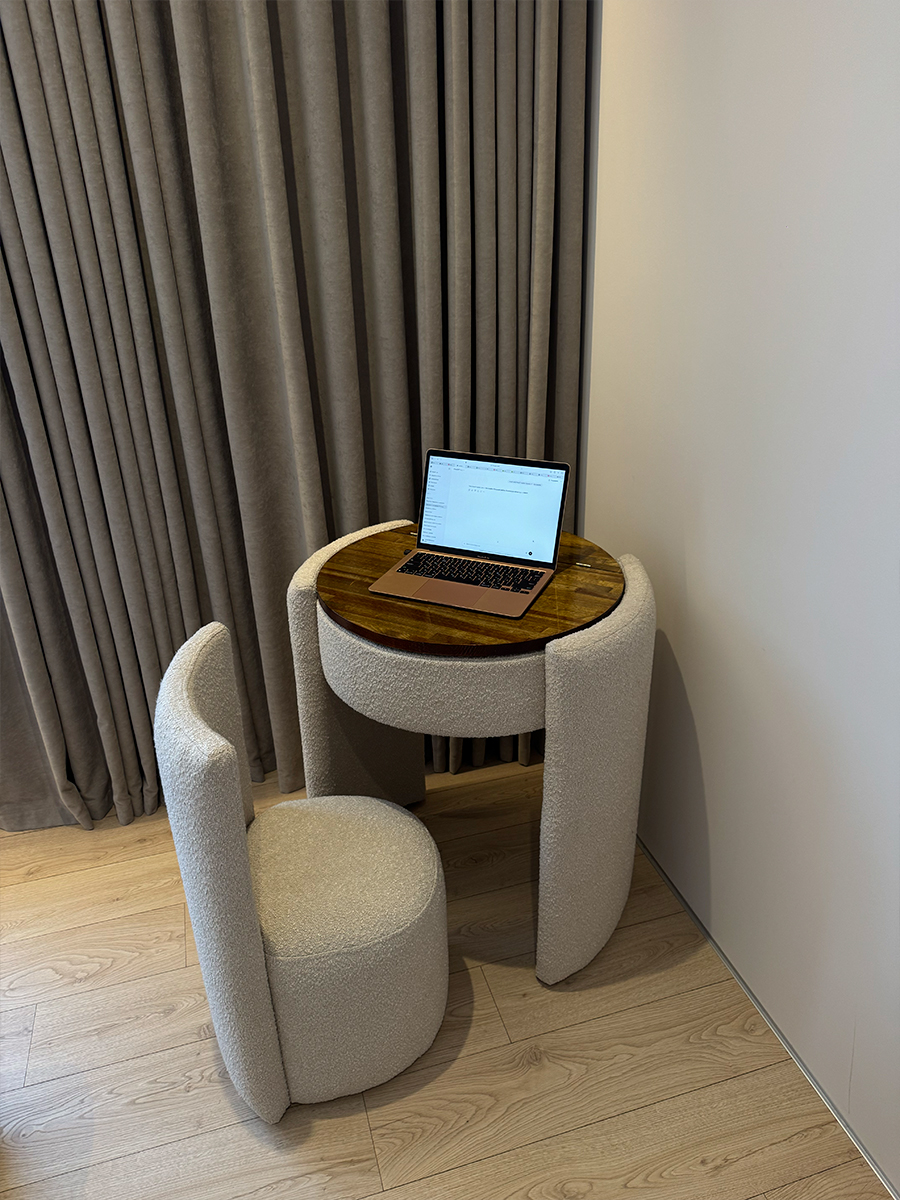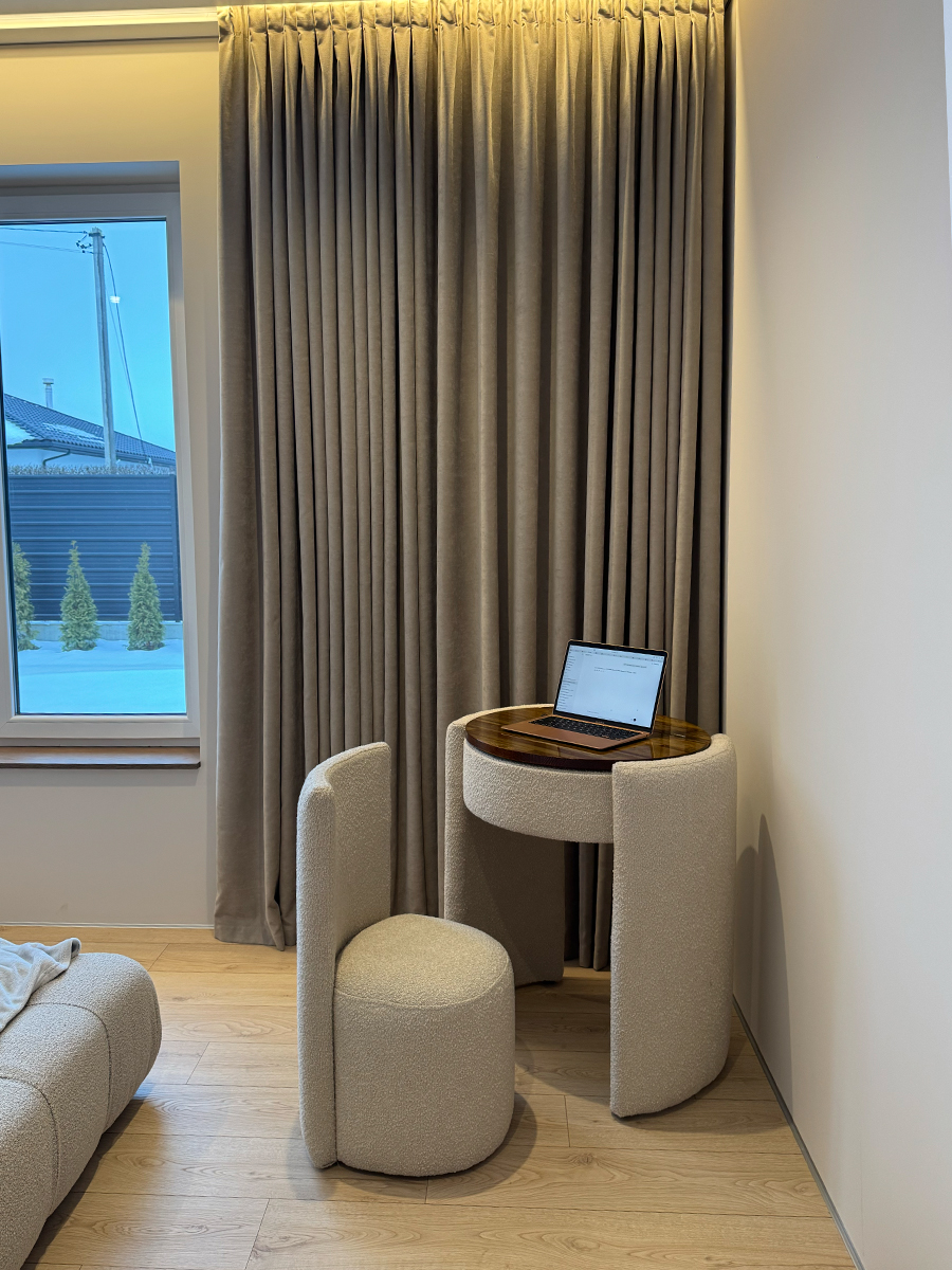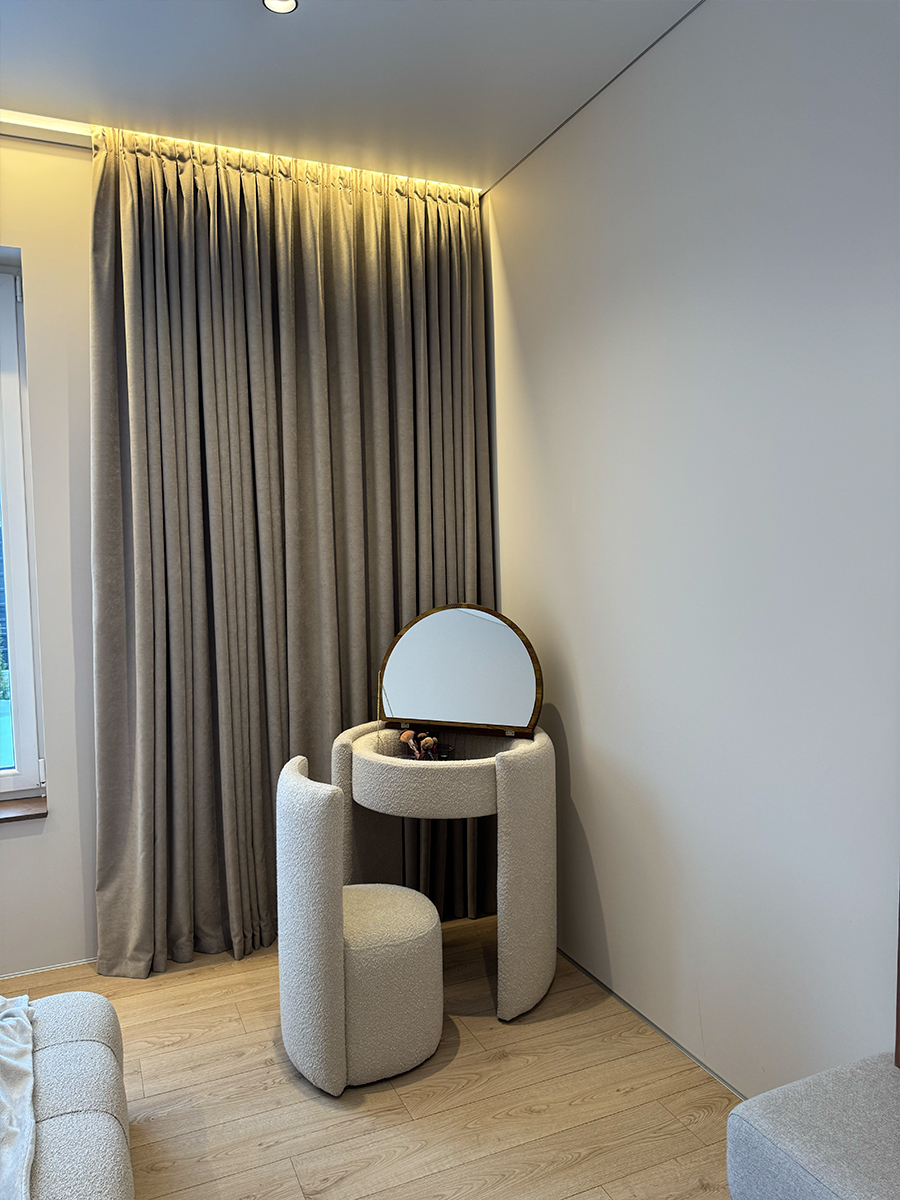 Чарівний косметичний столик із кріслом поєднує стиль і практичність. Він має нішу для зберігання косметики, вбудоване дзеркало та стільницю з натурального дерева. У закритому вигляді столик компактний, може слугувати робочою поверхнею або стильною консоллю. Тканину крісла можна обрати в будь-якому кольорі — у тон ліжка або як акцент інтер’єру.